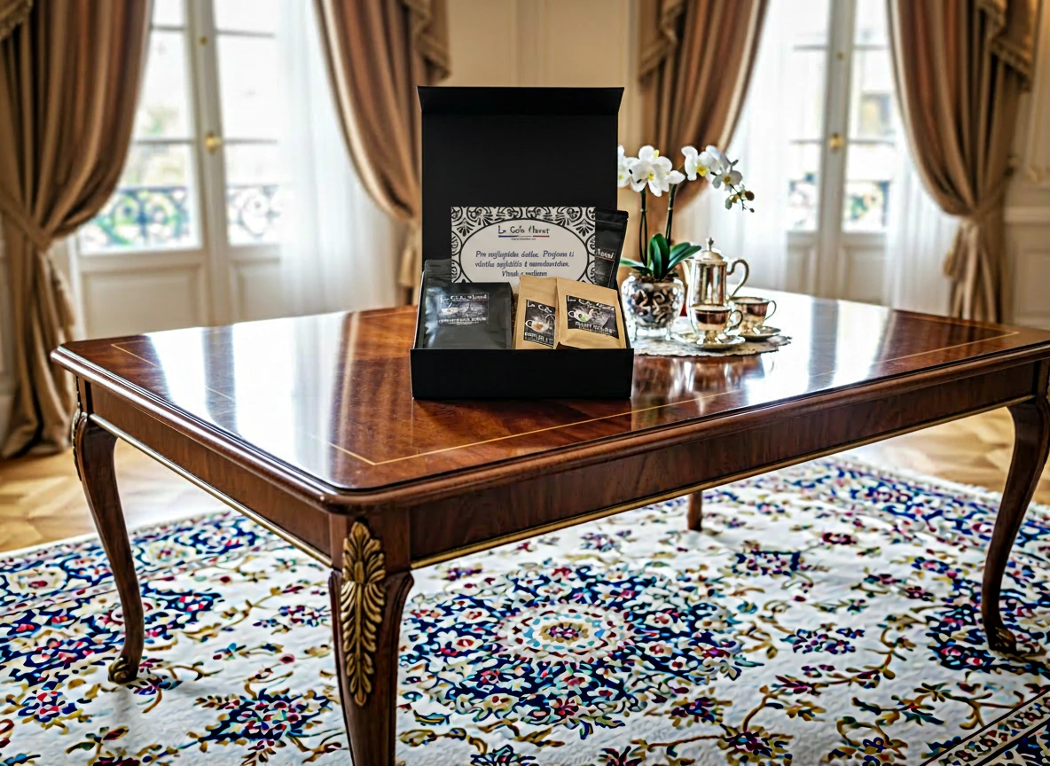 Darčeková krabica: čierna luxusná kartónová krabica so zlatým textom "Le Cafe Manet" na vrchu, krabica má štýlové vyklápacie otváranie s magnetom