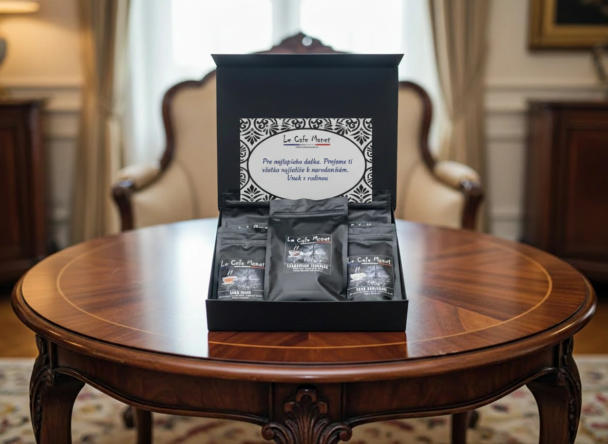 Luxusná čierna darčeková krabica so zlatým textom "Le Cafe Manet" a štýlovým otváraním s magnetom. Krabica obsahuje darčekové balenie s kolekciou prémiových kvalitných káv.