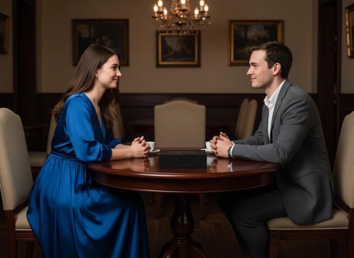 Darčeková krabica: čierna luxusná kartónová krabica so zlatým textom "Le Cafe Manet" na vrchu, krabica má štýlové vyklápacie otváranie s magnetom