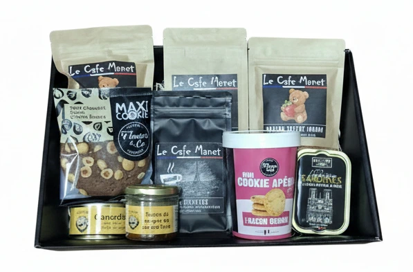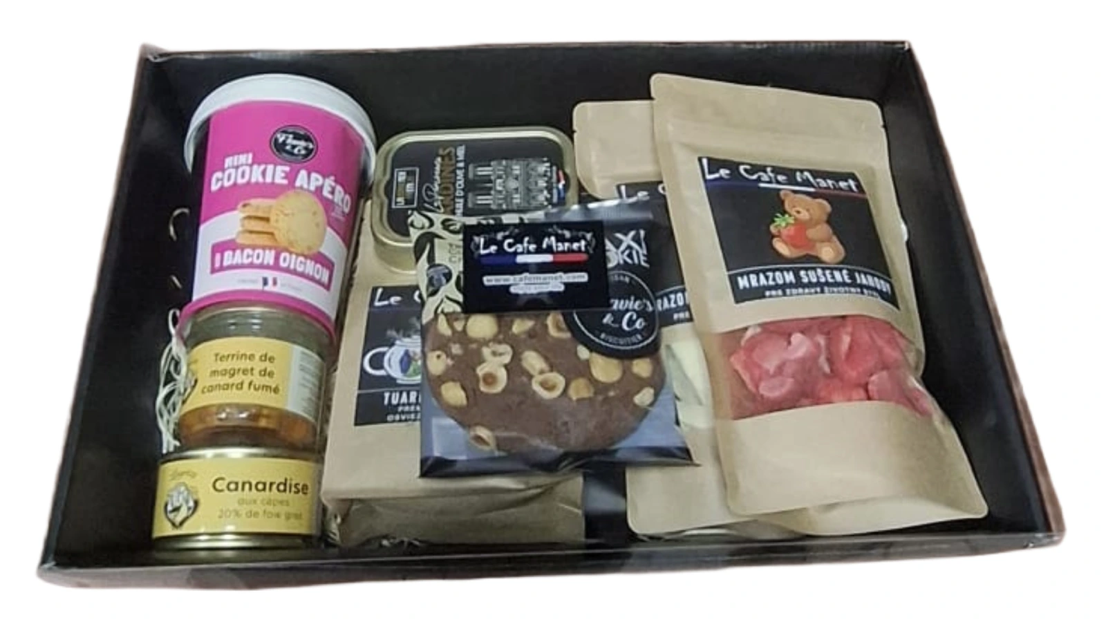 Ochutnávkový darčekový kôš plný francúzskych delikaties a výrobkov značky Le Cafe Manet. Vhodné ako luxusný darček nie len pre gurmána.
