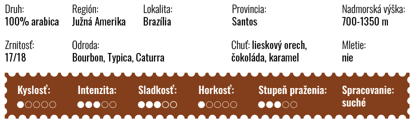 Táto káva je vhodná pre všetkých, ktorý obľubujú jemné lahodné kávy s nízkou kyslosťou, primeranou intenzitou a nízkou horkosťou. Či ste odborník na kávu alebo s kávou len začínate, táto káva je pre vás ideálna rokmi overená voľba. Brazilia Santos je káva, ktorá nikoho neurazí.