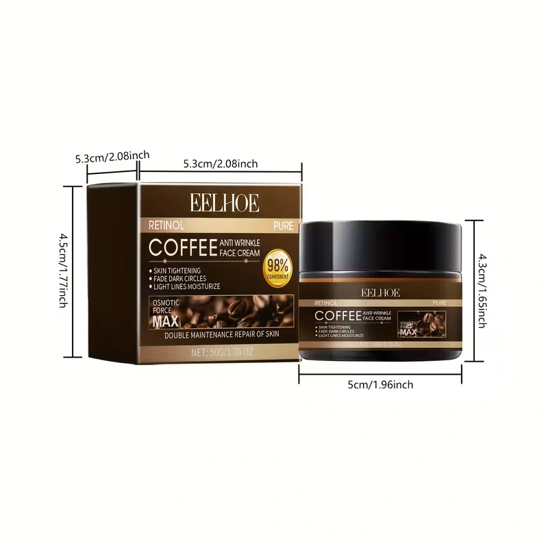 Retinolový kávový krém na tvár (50g). Krém vďaka retinolu spevňuje pleť, vyhladzuje vrásky, odstraňuje tmavé kruhy pod očami, hydratuje a dodáva pleti mladistvejší vzhľad. Krém je vhodný pre všetky typy pleti, vrátane citlivej pleti.