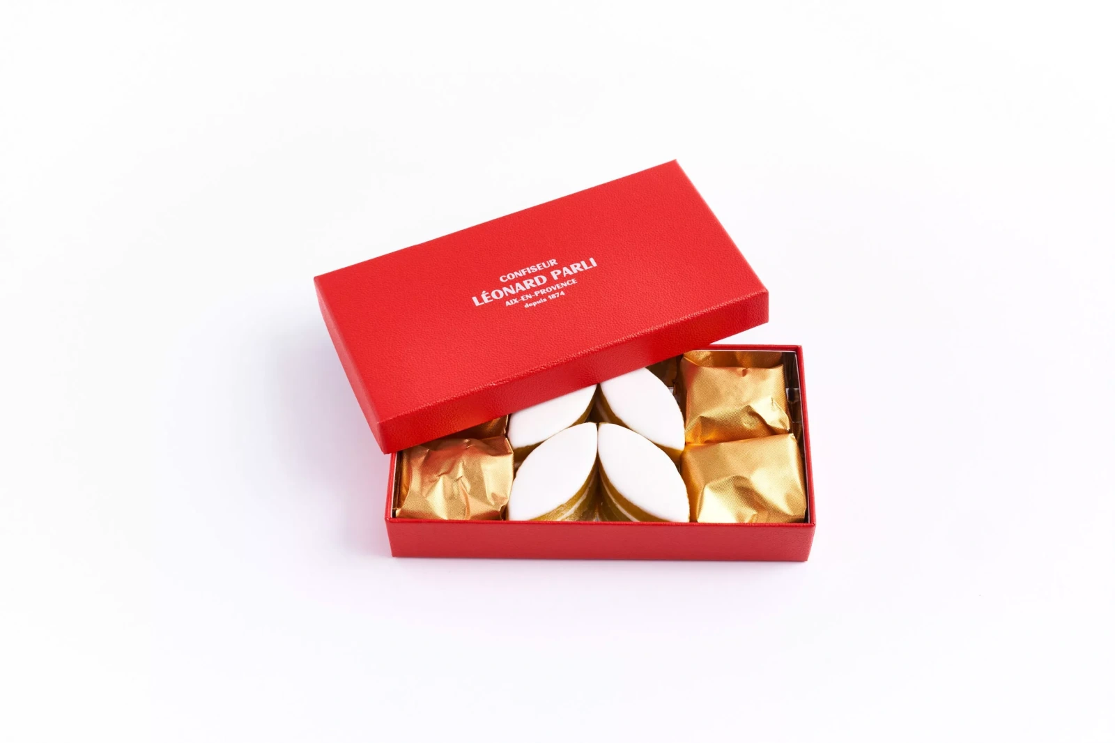 Elegantná krabička s francúzskymi tradičnými cukríkmi Léonard Parli Calissons a celými remeselne kandizovanými gaštanmi. Vytvorené a vyrobené vo Francúzsku. Tradičné a remeselne vyrobené. Vhodné ako darček.