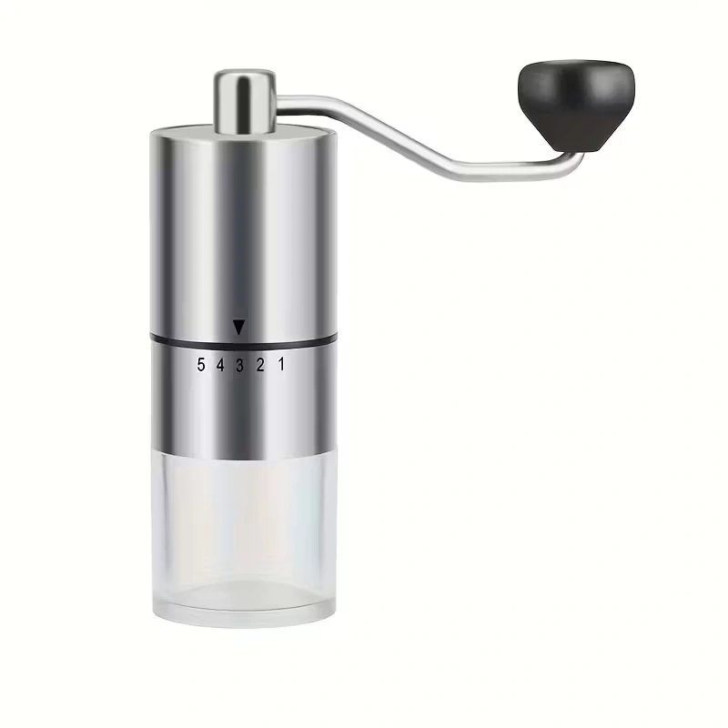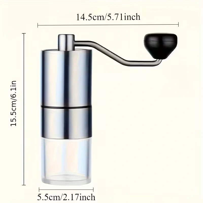 Ručný manuálny mlynček na kávu z nehrdzavejúcej ocele s čiernou rukoväťou. Prenosný mlynček na kávu na kempovanie, cestovanie, kancelárske a domáce použitie (odporúčame na použitie pri malých množstvách kávy).
